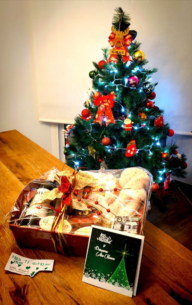 Durante la visita ya tenía previsto tener algún detalle navideño con los discentes: les había preparado unas bolas de Navidad personalizadas con sus nombres para que decorasen sus árboles navideños; pero la verdad es que ha sido muy emocionante lo que ha ocurrido en el aula. Sin que yo sospechase nada, todos los alumnos se han levantado de sus mesas, me han dado un fuerte abrazo y me han entregado esta magnífica cesta navideña: